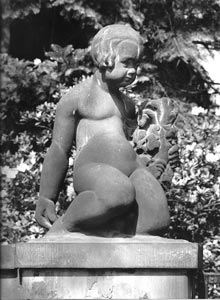 Kinderfiguren Mädchen und Junge, 1914, ehemals Privatbesitz Dresden, seit 1994 verschollen; hier Figur Mädchen, Original 1914, Postaer Sandstein, historisches Foto und Figur Mädchen, Modellrekonstruktion in Ton, 2012 |