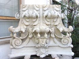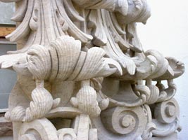 Potsdam, Rekonstruktion Stadtschloss (Landtag Brandenburg), Fassade, korinthische Kapitelle über den Pilastern, um 1745, 1,40m breit, 5 Kopien in Cottaer Sandstein, hier fertige Kopie und Detail, 2011 | ||||||||||||