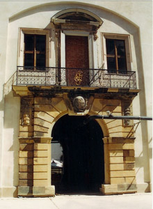 Dresden, Residenzschloss, Johann Georg Starcke, Portal im kleinen Schlosshof, 1682, formschlüssiges Einarbeiten (Arbeits- und Endzustand) einer Vierung am Lorbeer-Feston, Postaer Sandstein |