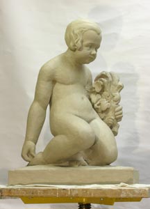 Kinderfiguren Mädchen und Junge, 1914, ehemals Privatbesitz Dresden, seit 1994 verschollen; hier Figur Mädchen, Original 1914, Postaer Sandstein, historisches Foto und Figur Mädchen, Modellrekonstruktion in Ton, 2012 |