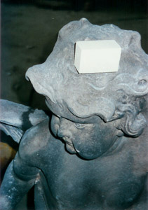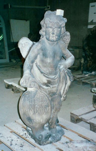 Jacob Insadeck, Putti (Allegorien), um 1735, Restaurierung (Reinigung, Ergänzung mit Steinersatzmasse, Konservierung), Beispiel einer Vierung aus Postaer Sandstein (vor Einfärbung) | |||||||||||||||