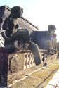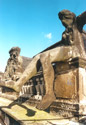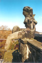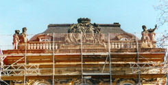 Schloss, Gartenseite, Mittelrisalit, Johann Christian Ehrlich/Johann Christoph Bosmann, Risalitgruppe (Fortuna und Fama, Wappenkartusche, zwei Balustradenvasen), 1754-56, Restaurierung (Schadenskartierung, Reinigung, Festigung, Nadelung loser Bereiche, Schollenhinterfüllung; Anböschungen, Reprofilierungen und Ergänzungen mit Kieselsäureester gebundener Steinersatzmasse, bildhauerische Ergänzungen und Kopie in Cottaer Sandstein, Hydrophopierung, Fassung der ein- und angefügten neuen Sandsteinteile mit Erdpigmenten, Maßnahmekartierung, Fotodokumentation) (beide Fotos zeigen den Vorzustand 2000) | ||||||||||||||||||||||||||||||||||||||||||||||||||||||||||||||||||||||||||||||||||||||||||||
